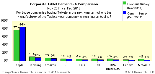 A total of 84% of companies planning to buy tablets next quarter now say they’ll purchase iPads – a 7-pt leap since the previous survey.