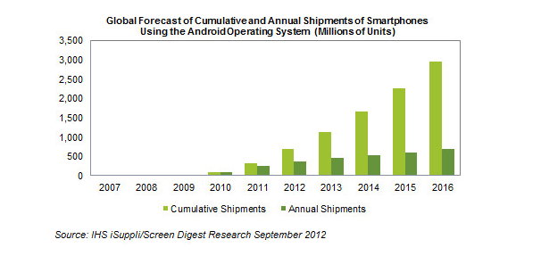 Market research firm IHS iSuppli estimates that by 2013, cumulative shipments of Android smartphones will exceed 1 billion units. Handsets shipping with Google’s (GOOG) mobile operating system are expected to reach 451 million units in 2013, an increase from 357 million in 2012, and approach 3 billion cumulative units in 2016. For comparison, cumulative shipments of Apple’s (AAPL) iOS platform are estimated to reach 527 million units in 2013 and aren’t expected to surpass 1 billion units until 2015. “The Androids are taking over the world of smartphones,” said Daniel Gleeson, mobile analyst for IHS. “We expect the Android operating system to become the first to reach the milestone of 1 billion shipments during its lifetime.” IHS’ press release follows below.