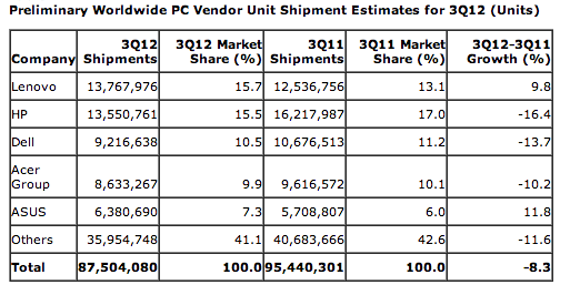 According to third quarter estimates from research firm Gartner, Lenovo (LNVGY) has edged out Hewlett-Packard (HPQ) to become the world’s largest PC vendor. Worldwide PC shipments in the third quarter declined more than 8% year-over-year to total 87.5 million units. The Chinese company is estimated to have shipped 13.7 million units in the quarter, representing a 9.8% year-over-year increase, compared to HP with shipments that declined more than 16% to 13.5 million units. In a statement to The Verge, however, the Palo Alto-based company claims Gartner’s report is less “comprehensive” due to its exclusion of workstations. HP instead points to rival research firm IDC and its estimates, which rank the company less than half a percentage point ahead of Lenovo. Worldwide PC shipments in 2012 are set to decline for the first time in over a decade as consumers embrace smartphones and tablets. IDC’s estimates follow below.